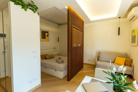 Die intervention betrifft eine wohnung in einem eleganten gebäude der 60er jahre.